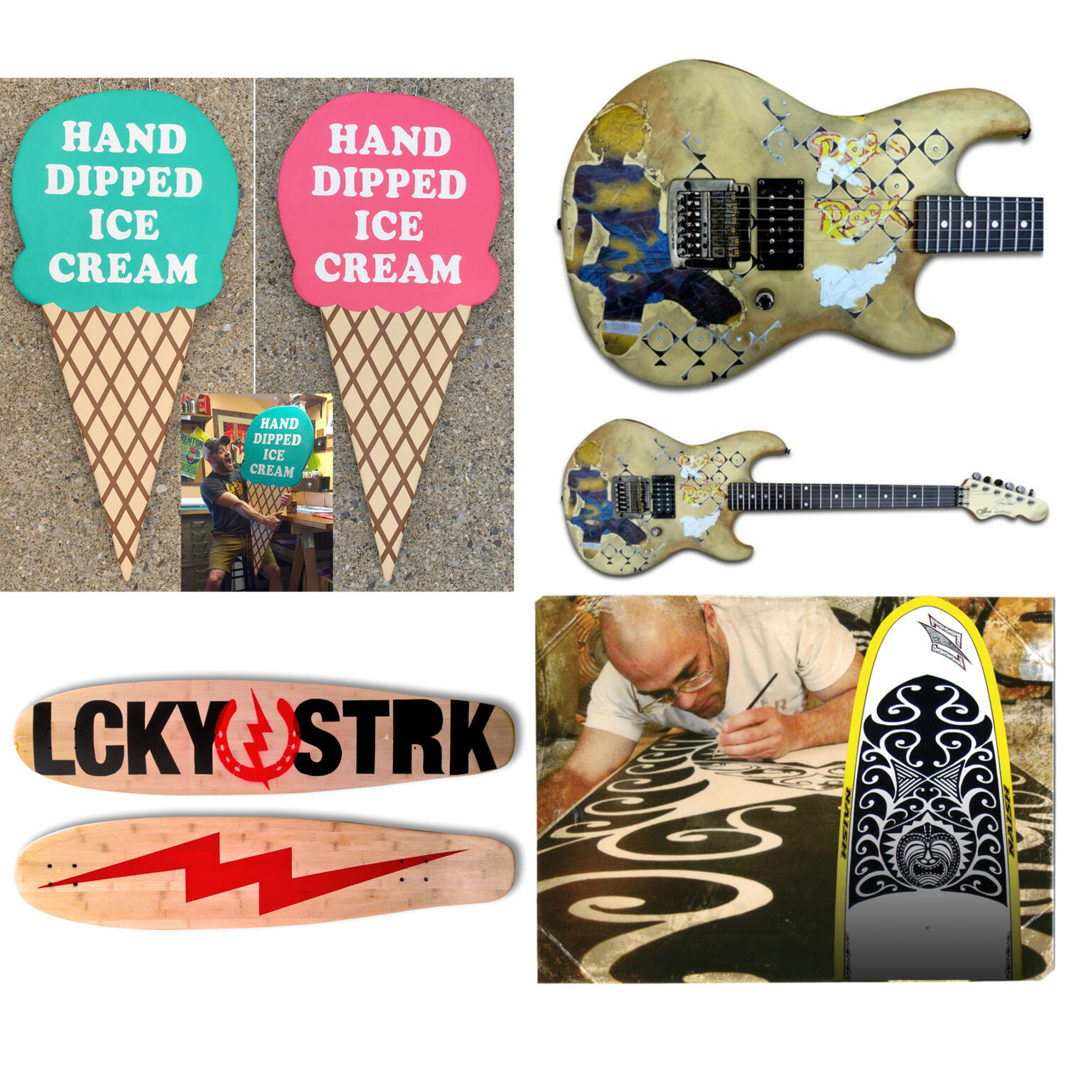 A local coffee shop needed their ice cream sign restored. I know the guitar looks grungy, but that's because it is a replica of a Jerry Cantrell (Alice In Chains) guitar. It looks just like the one displayed. Also, my long board and paddleboard were both blank canvases that needed a facelift.